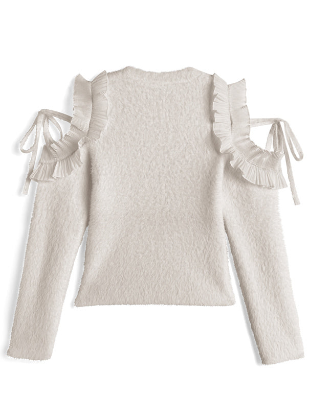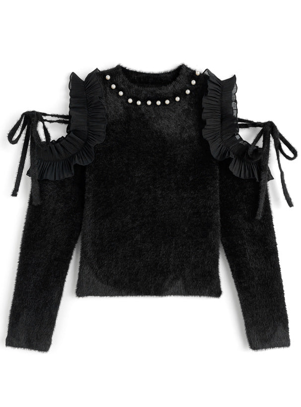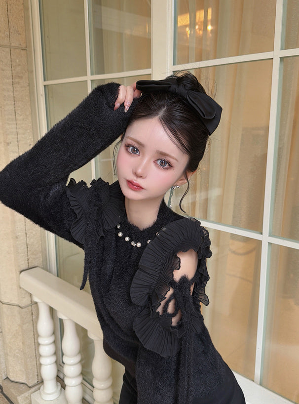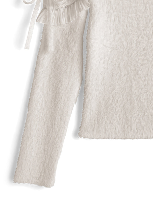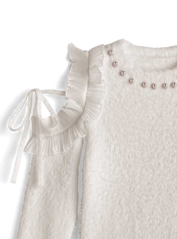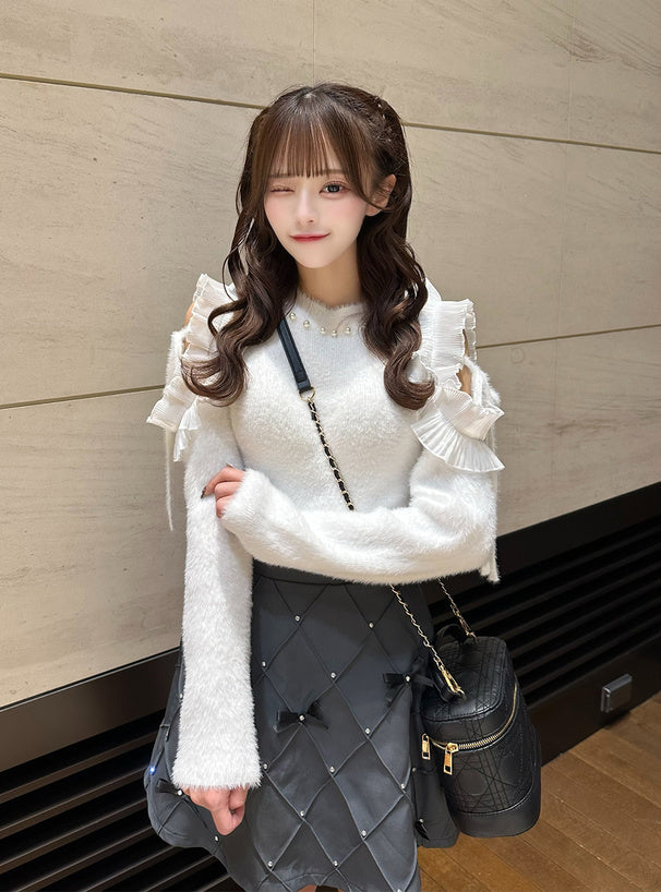 GRL 露肩荷葉邊緞帶珍珠毛絨針織上衣 2色 [TP0229]