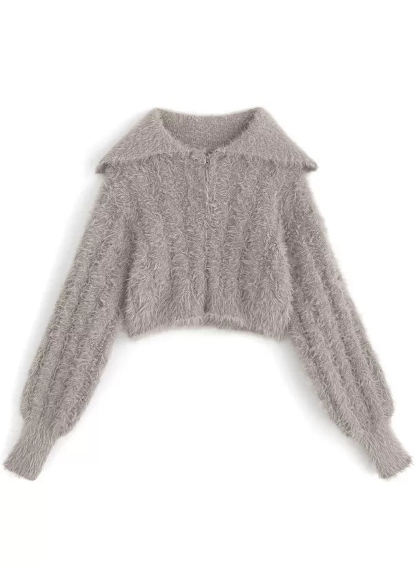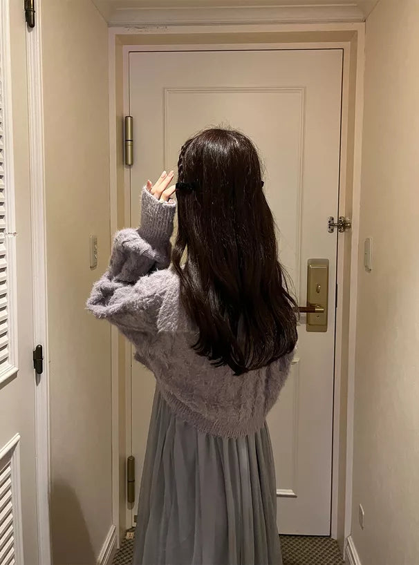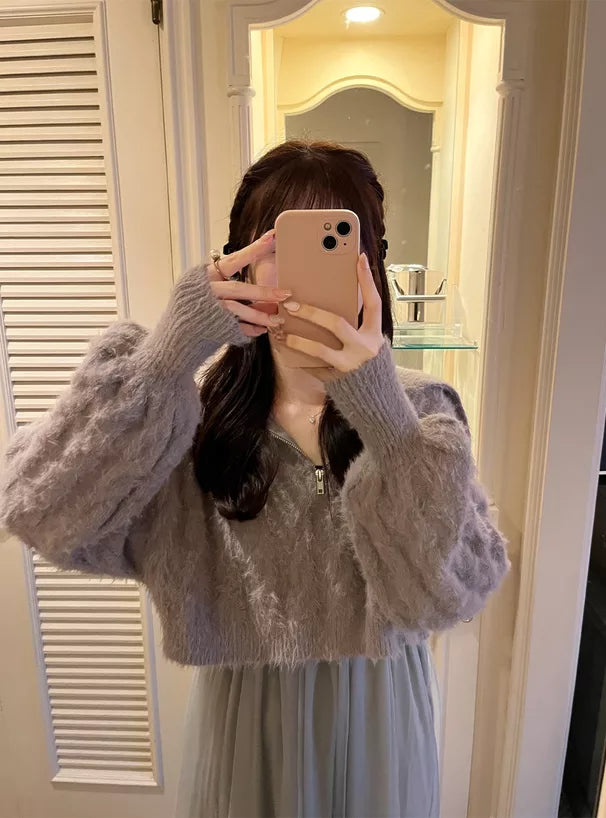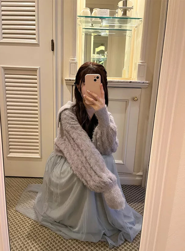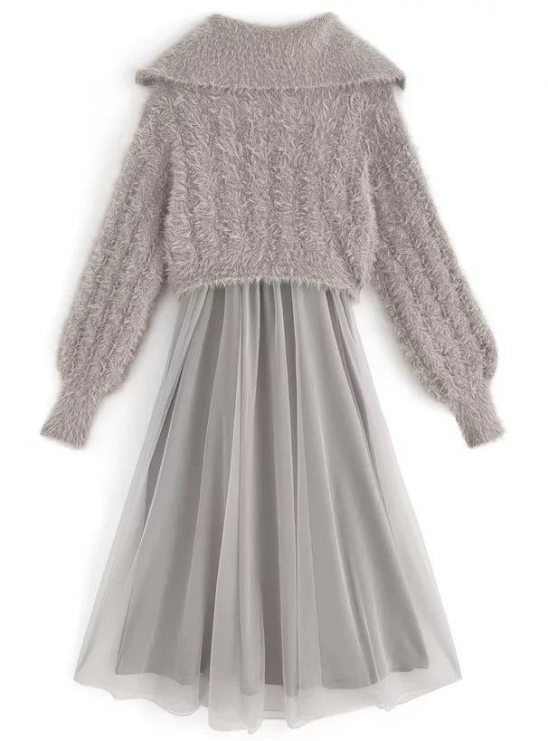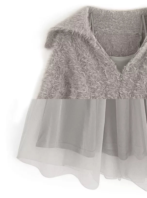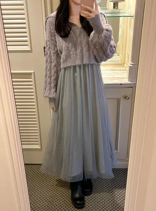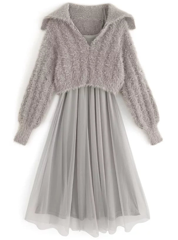 GRL 毛茸茸針織拉鍊上衣 x 薄紗連身裙套裝 [OP0134]