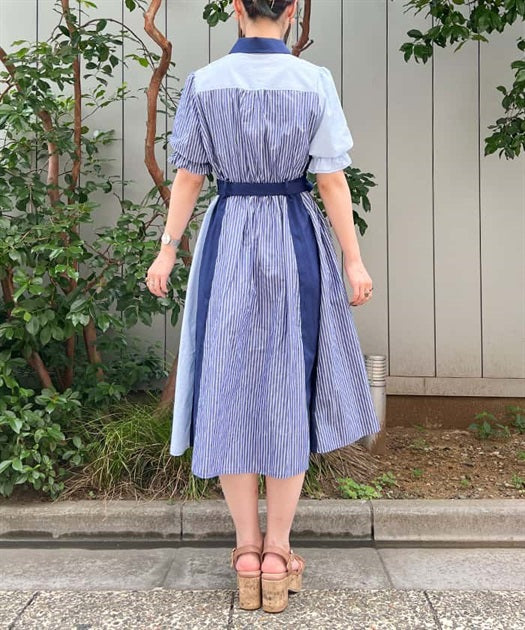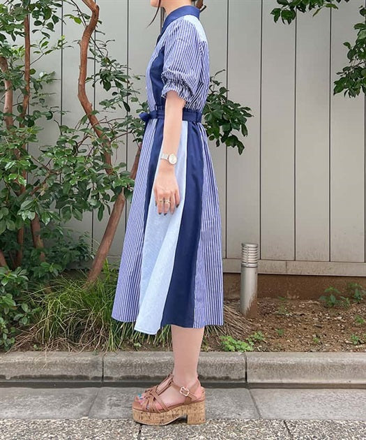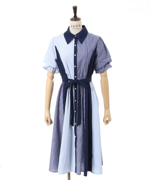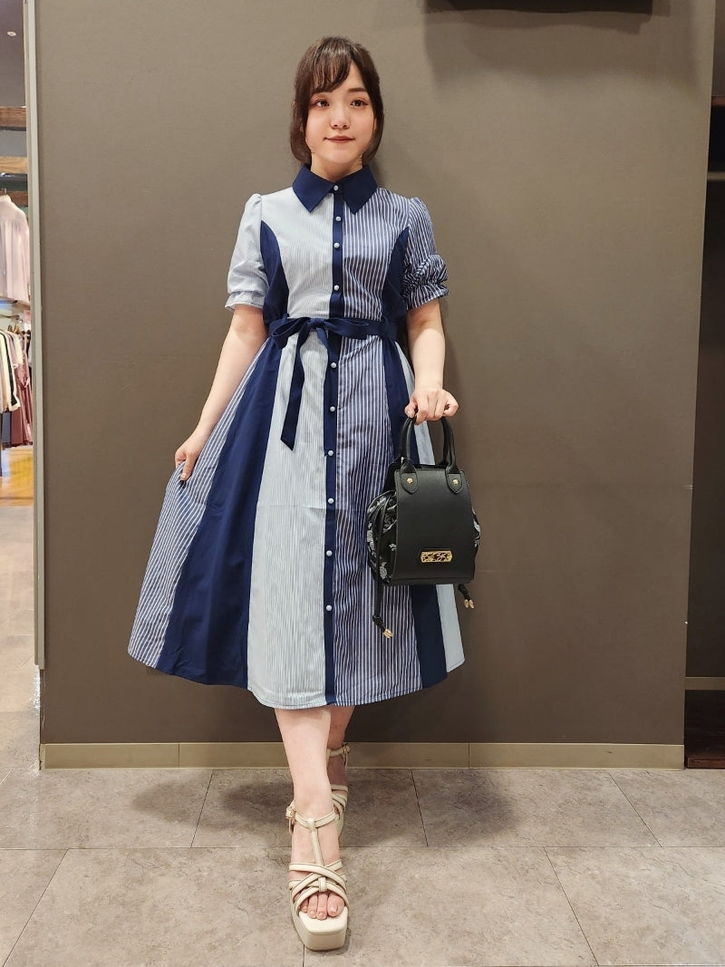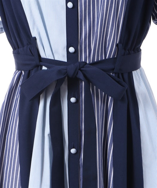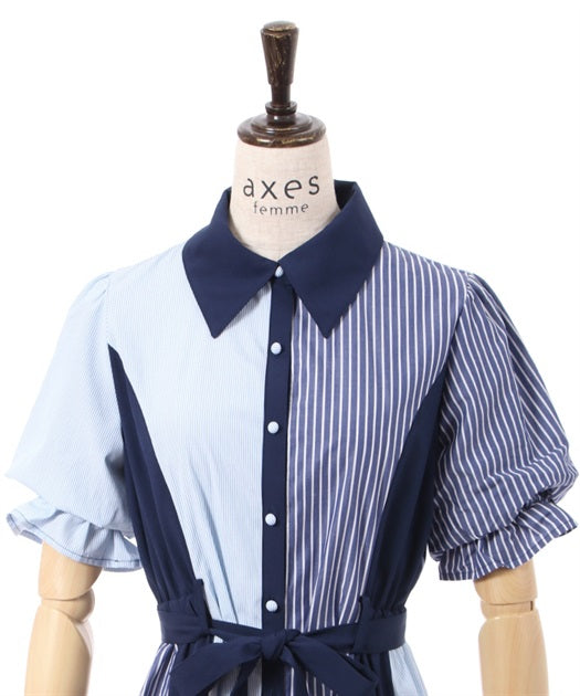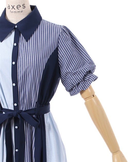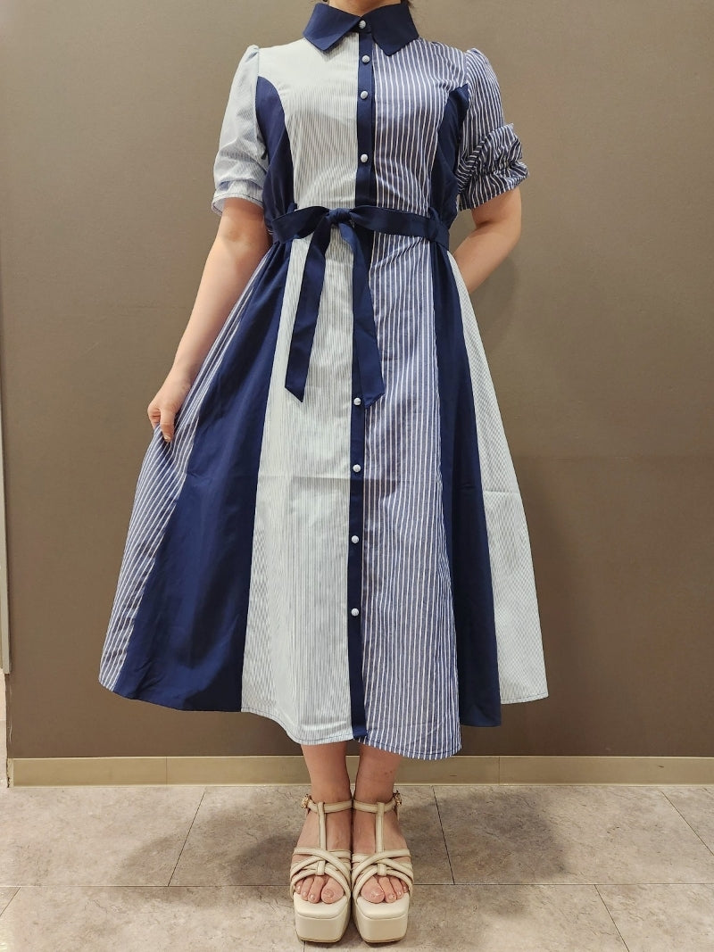 axes femme 條紋拼色綁帶襯衫連身裙 [OP268]