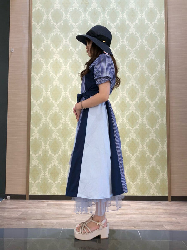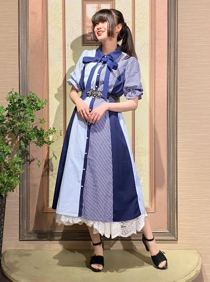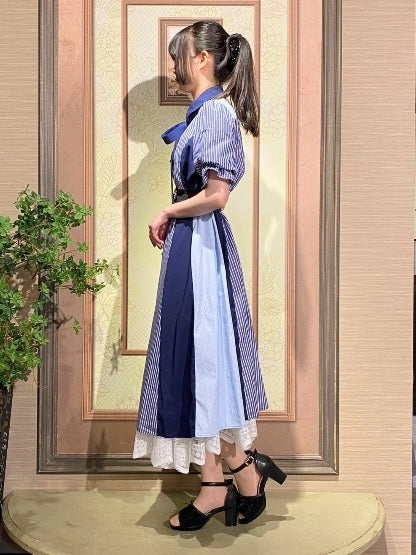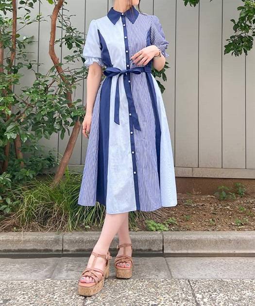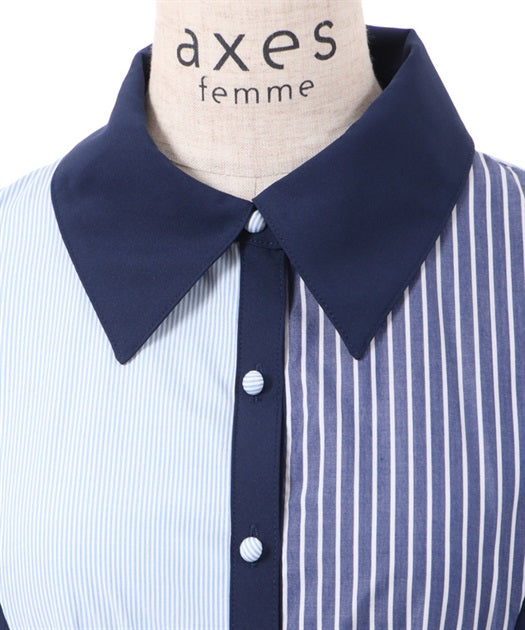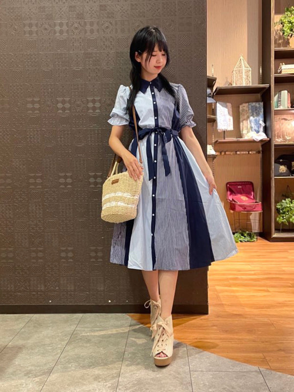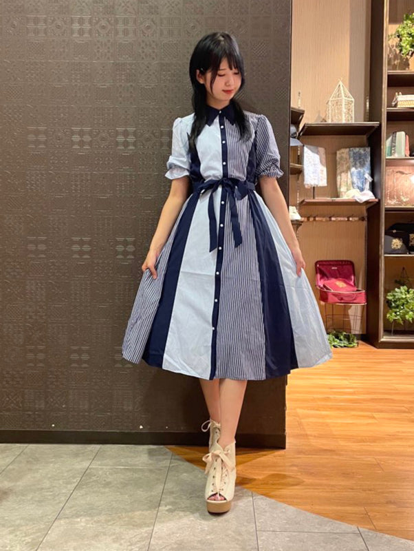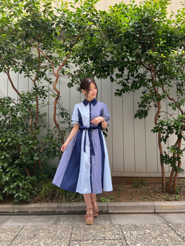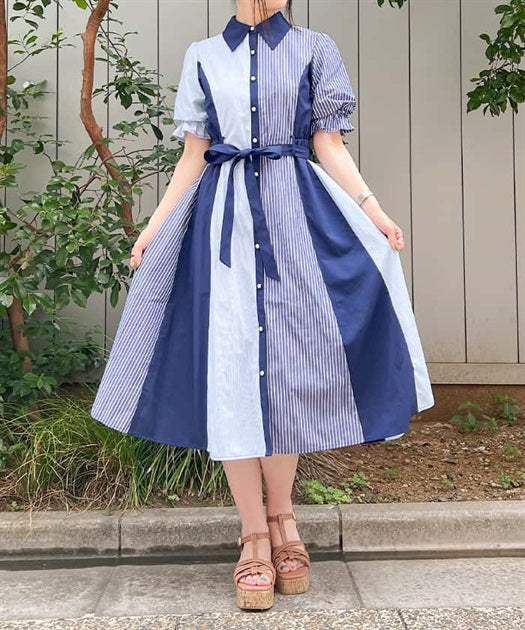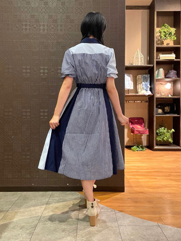 axes femme 條紋拼色綁帶襯衫連身裙 [OP268]