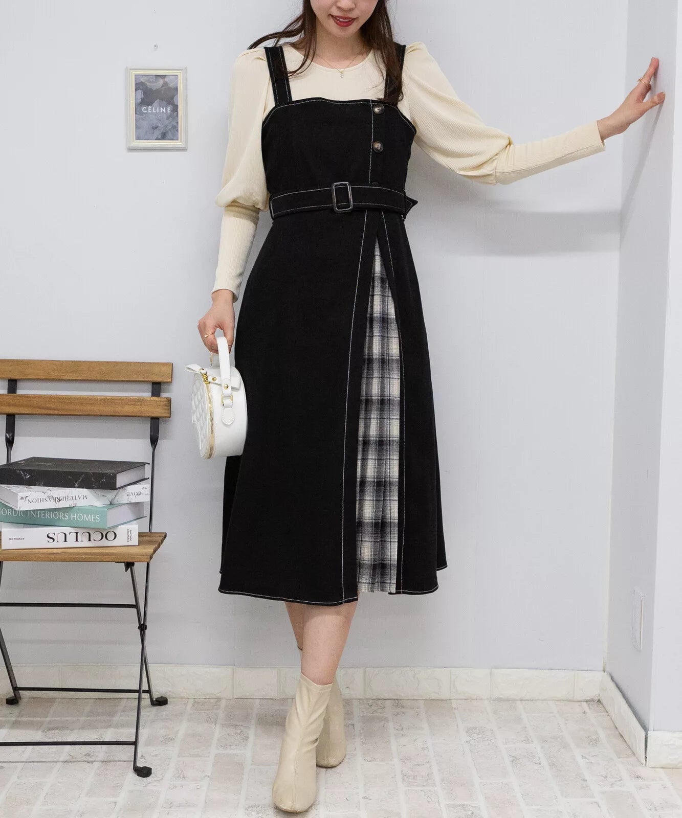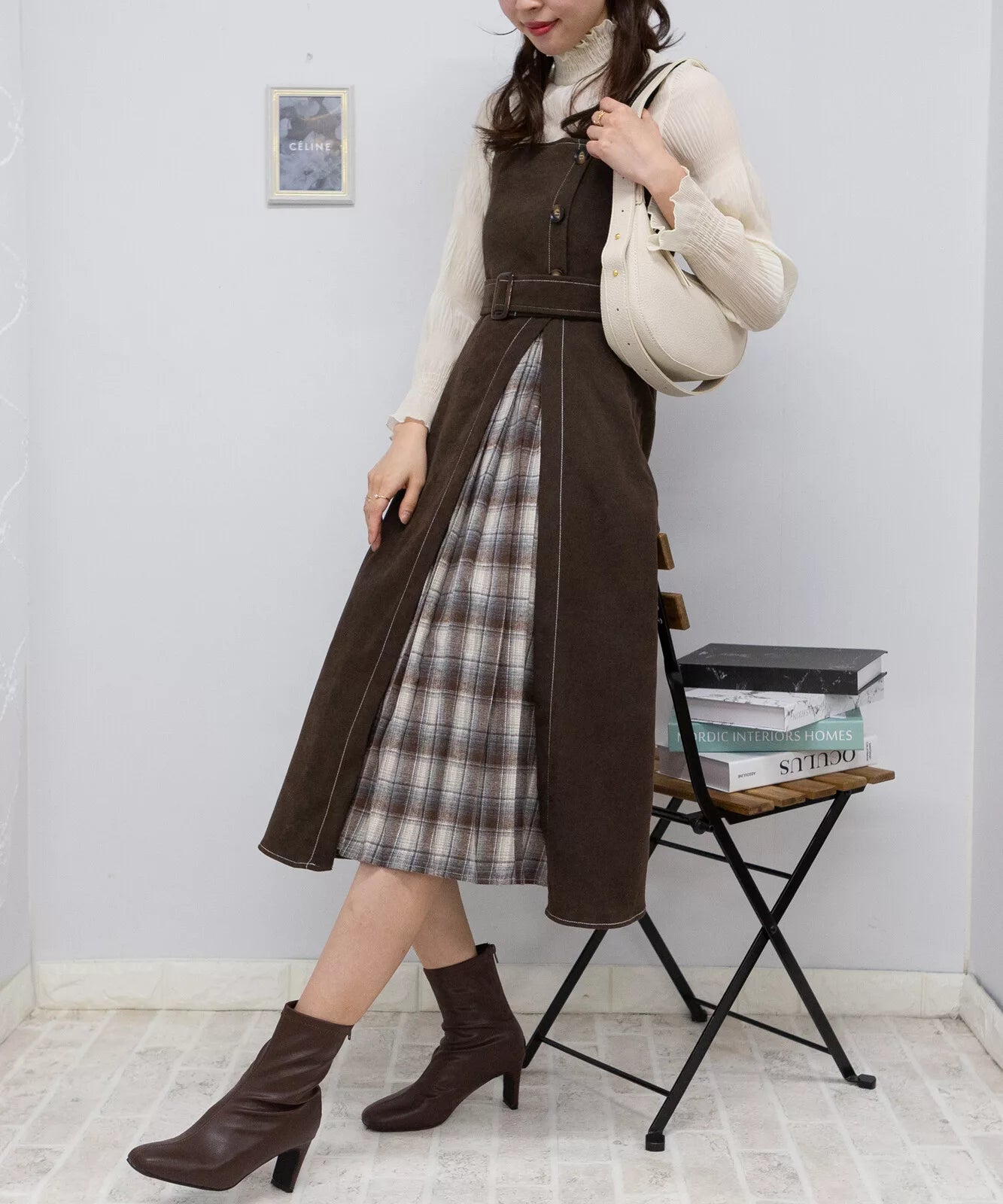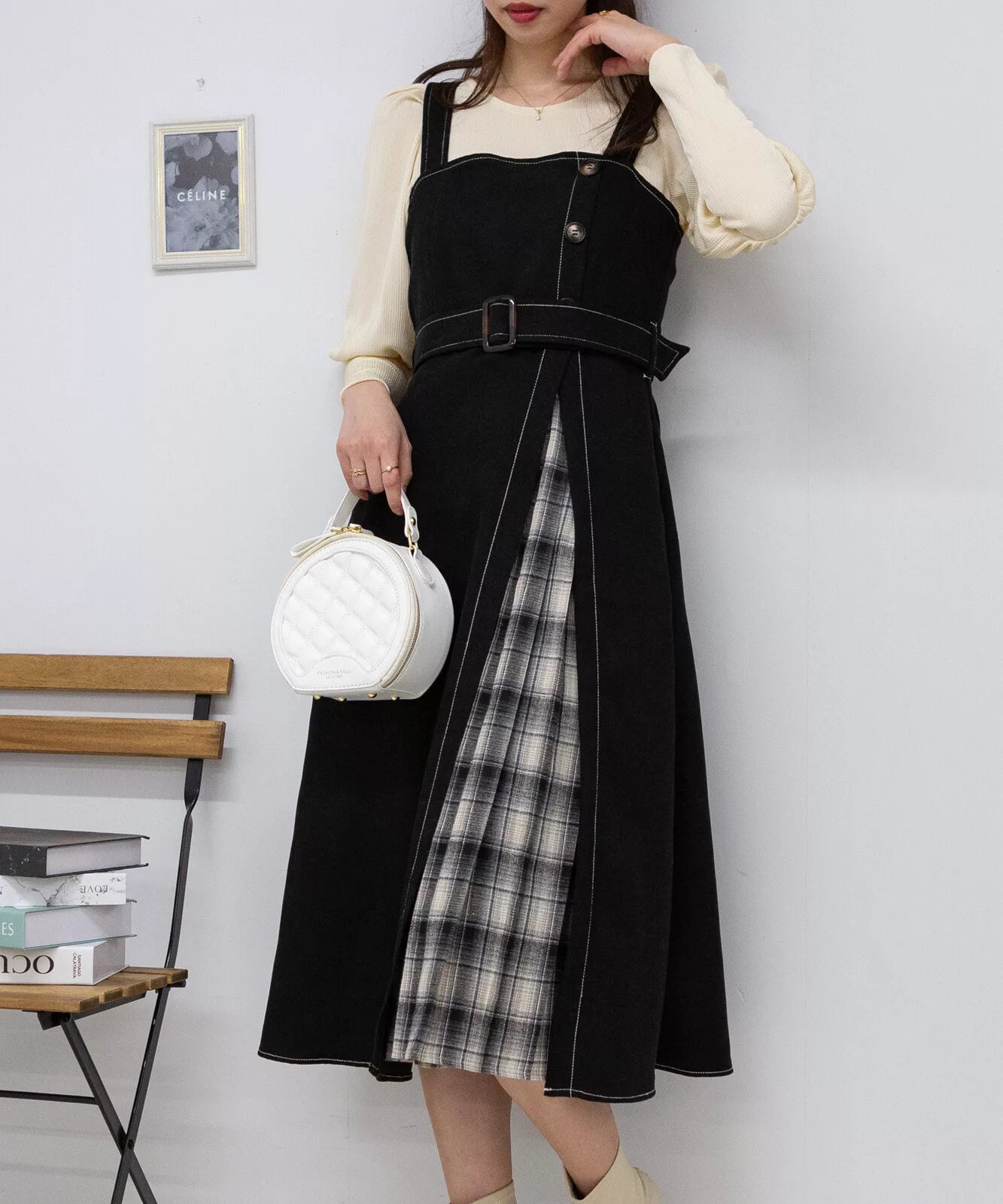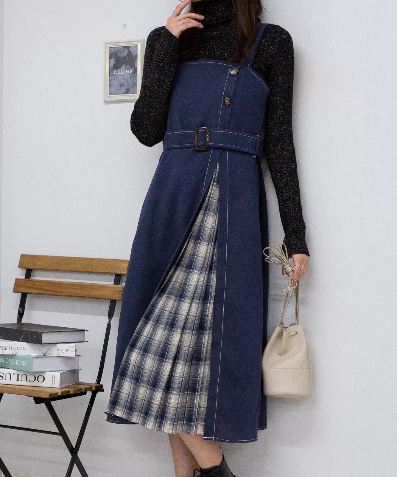 高腰腰帶拼格仔吊帶連身裙 3色 [OP308]