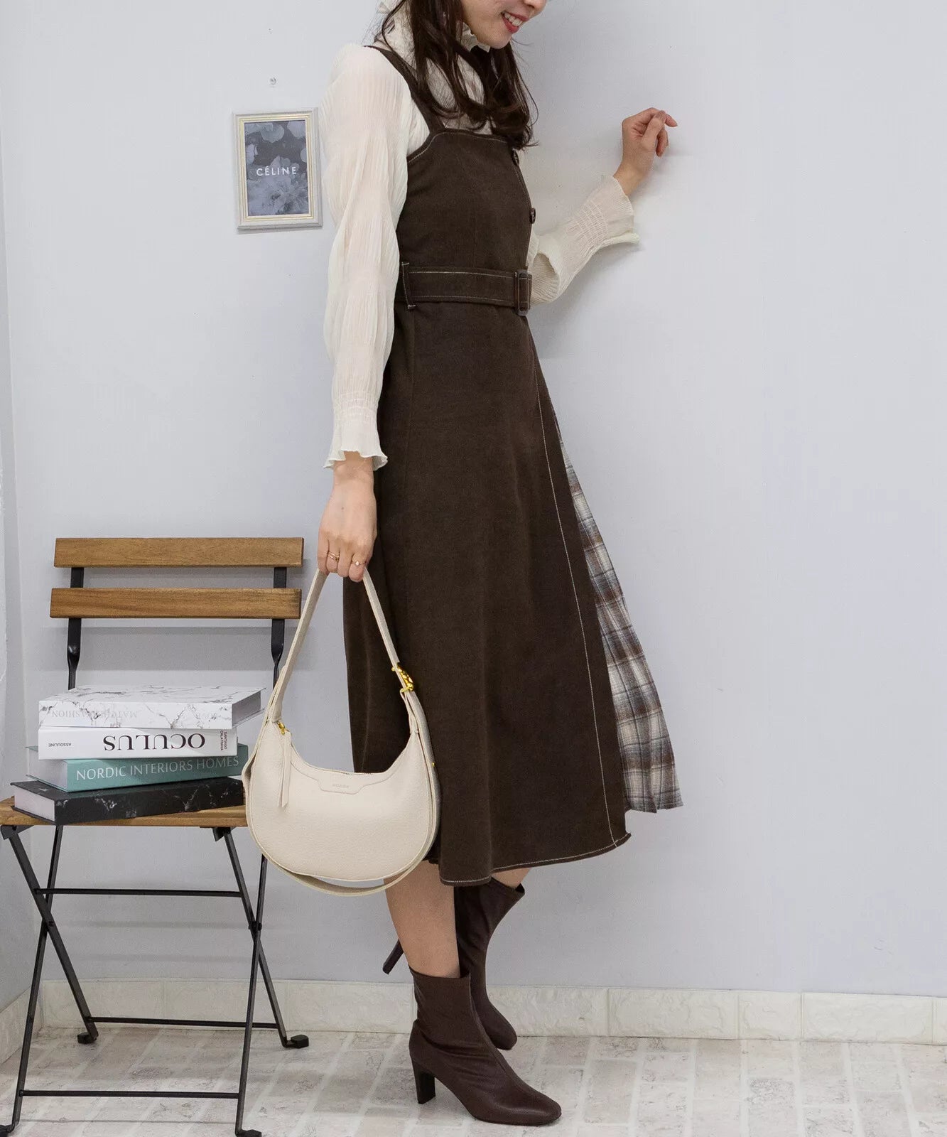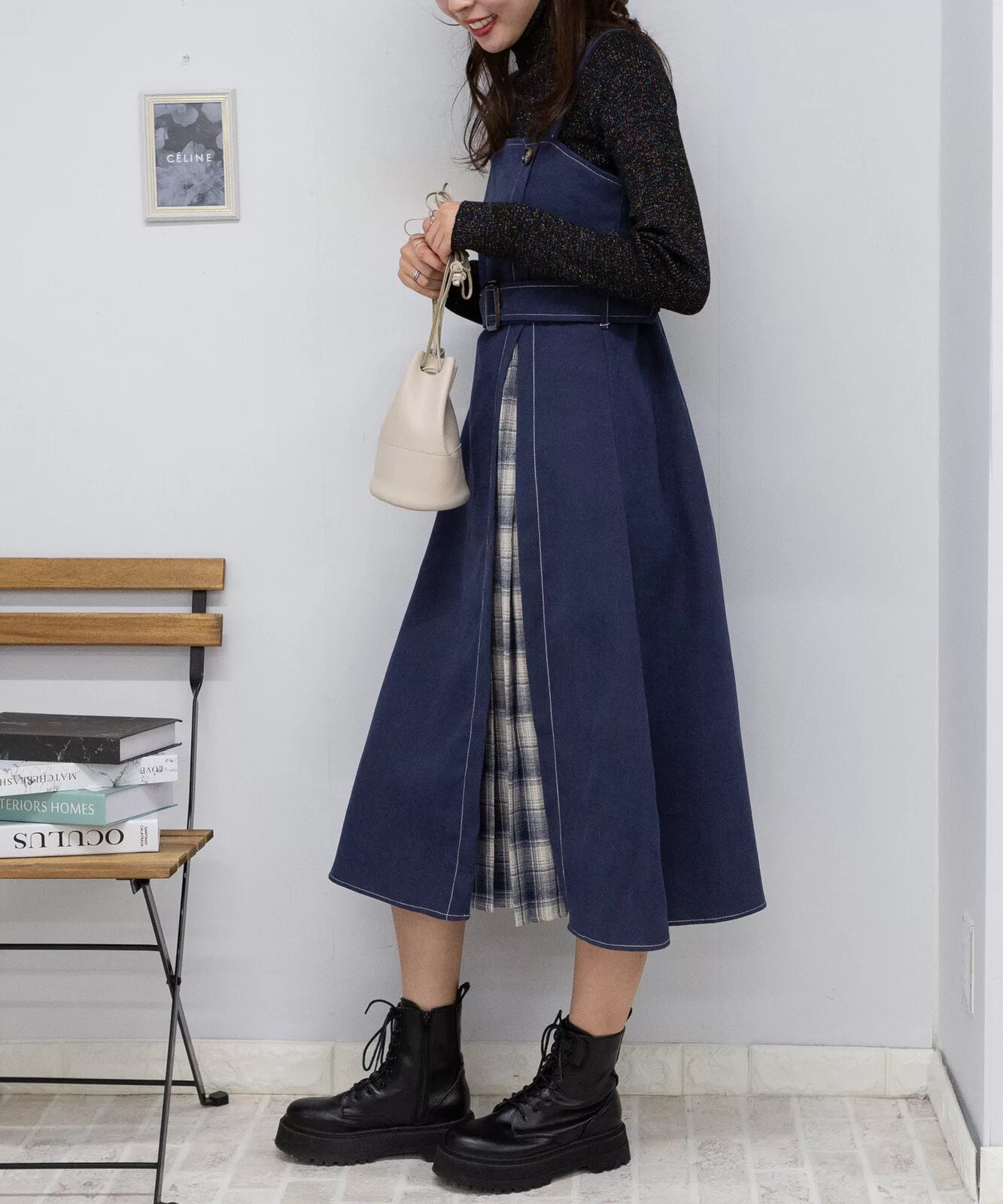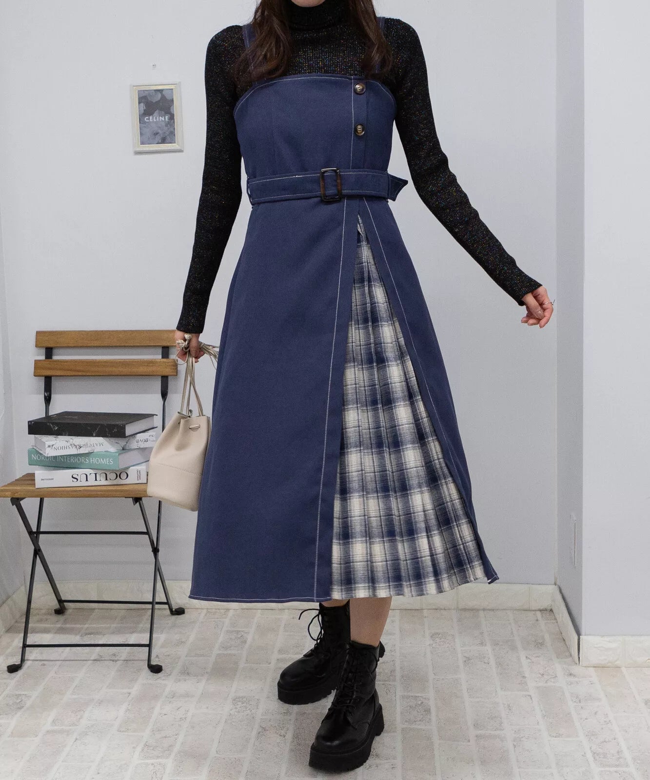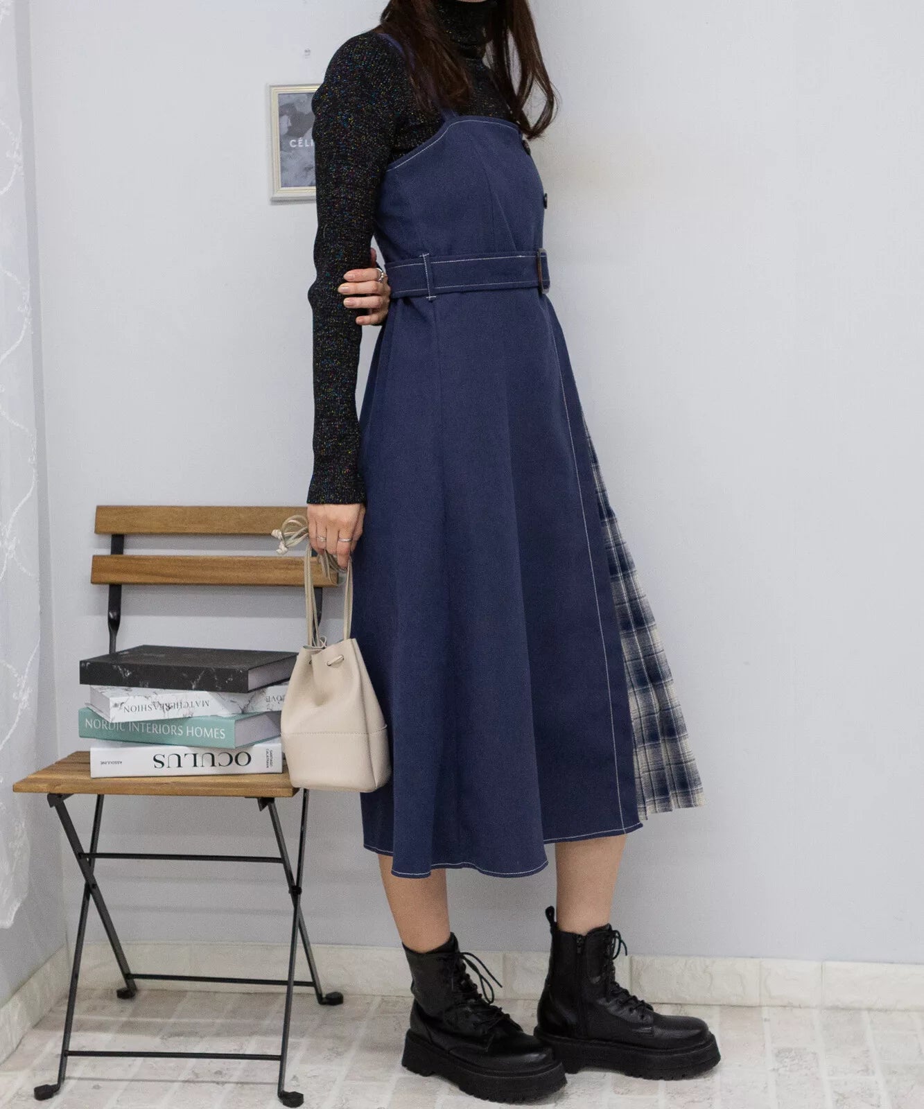 高腰腰帶拼格仔吊帶連身裙 3色 [OP308]