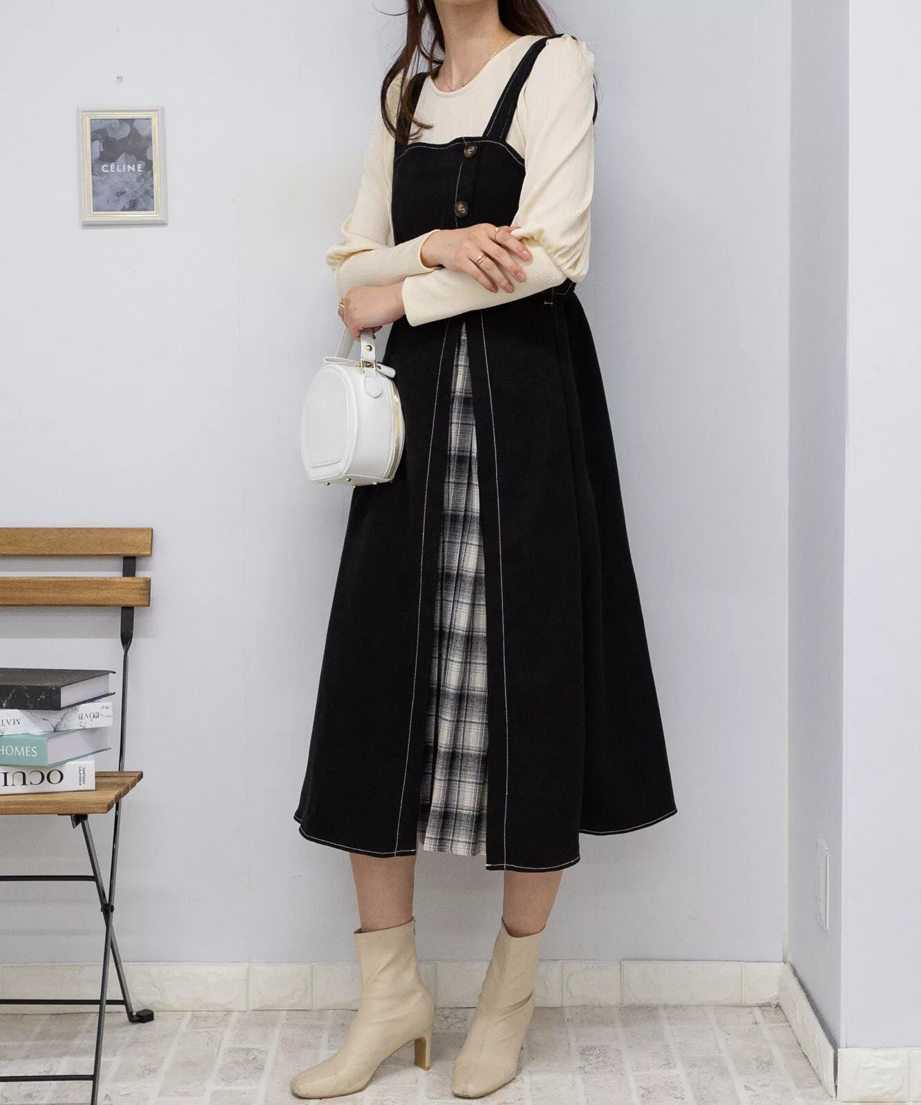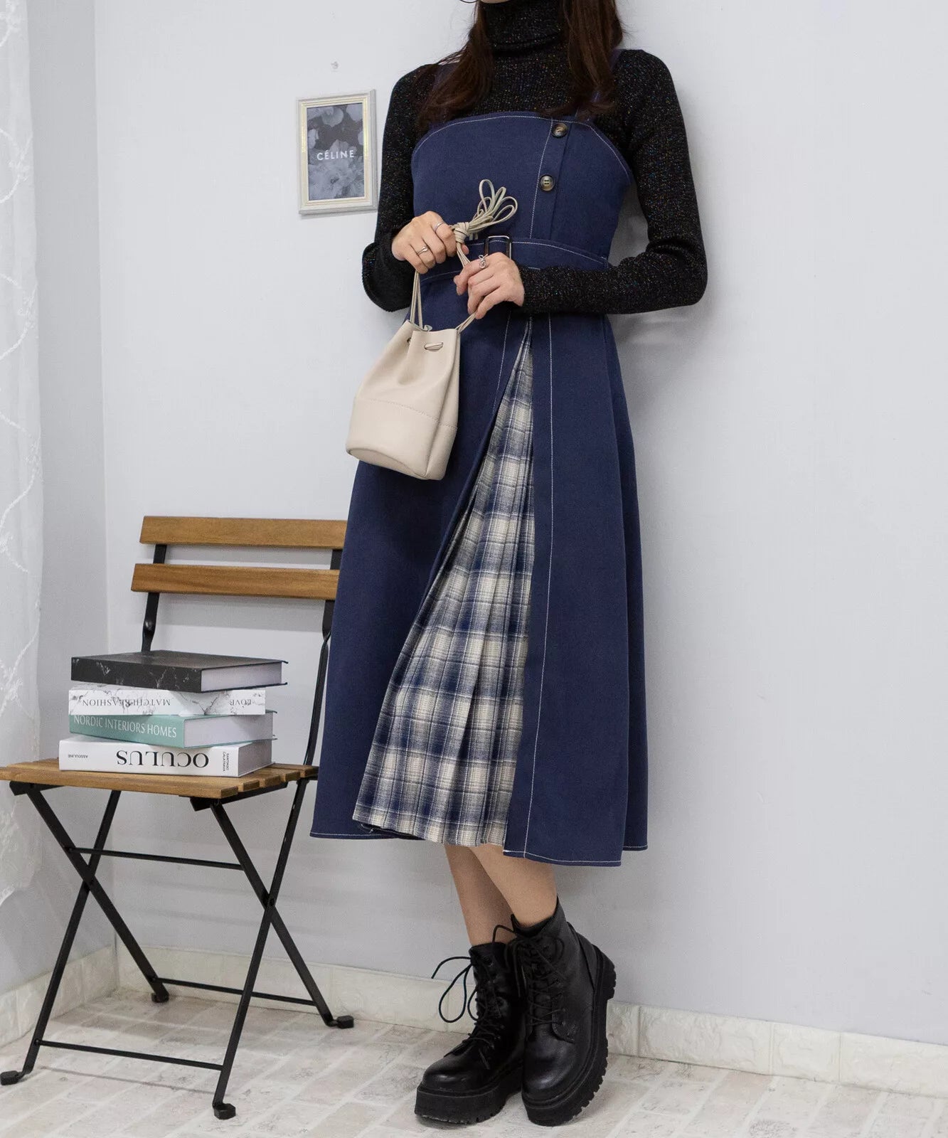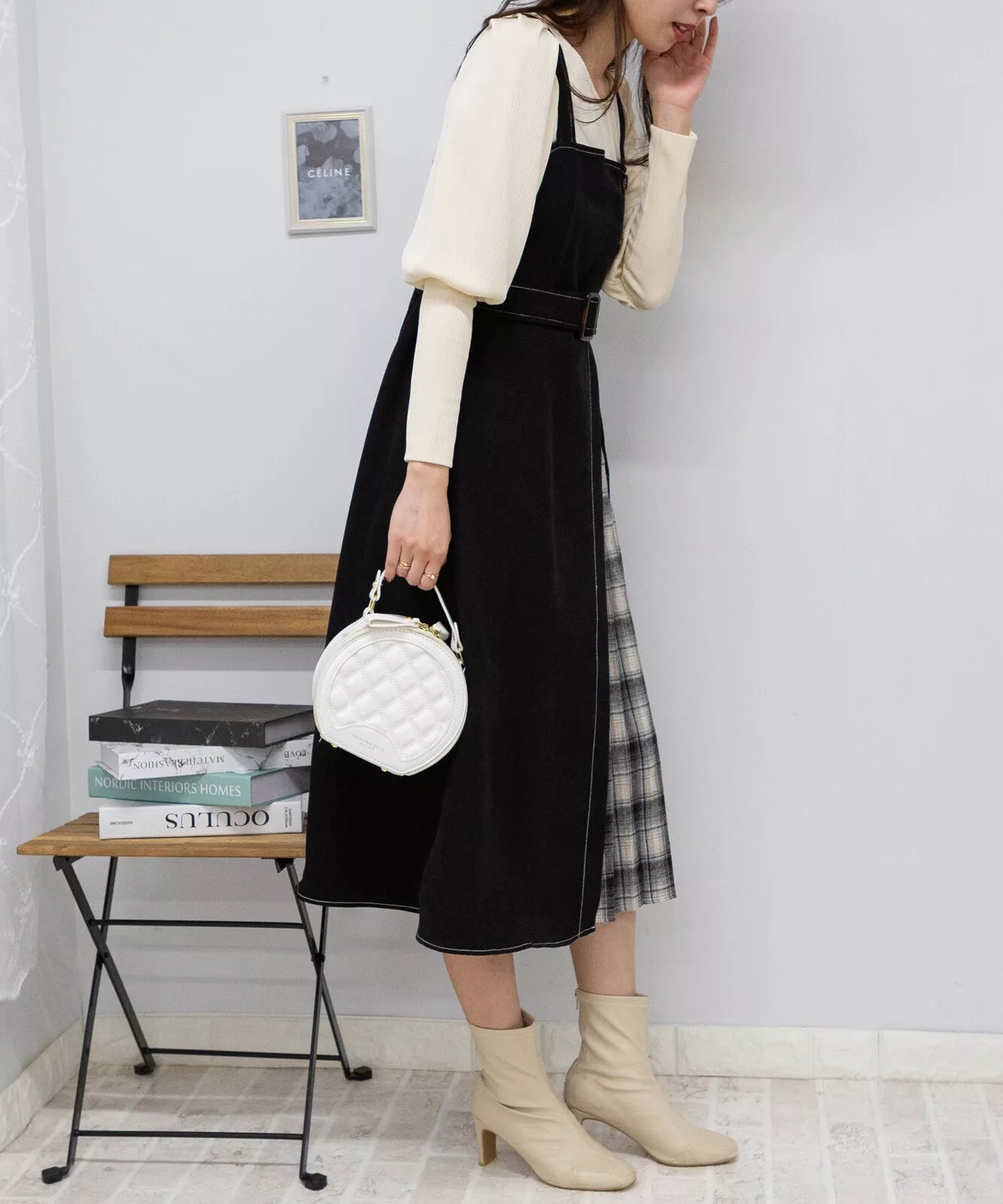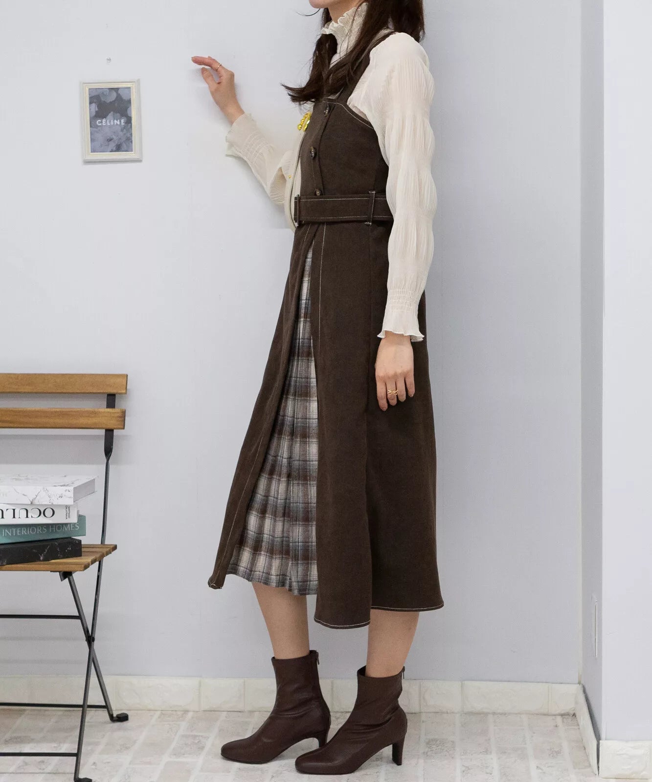 高腰腰帶拼格仔吊帶連身裙 3色 [OP308]