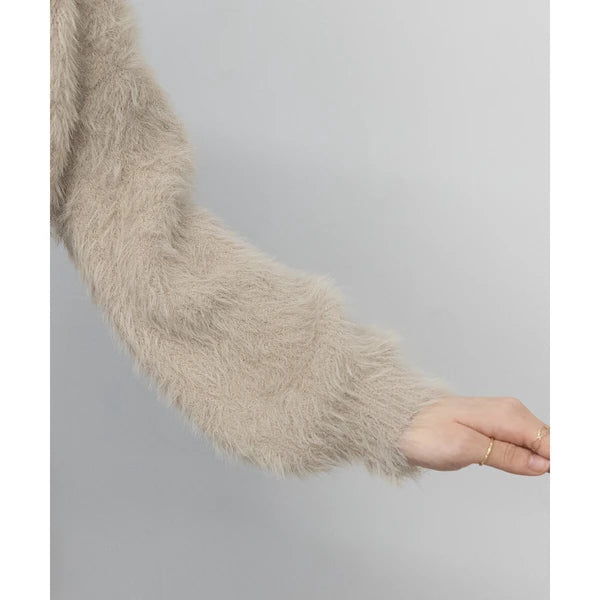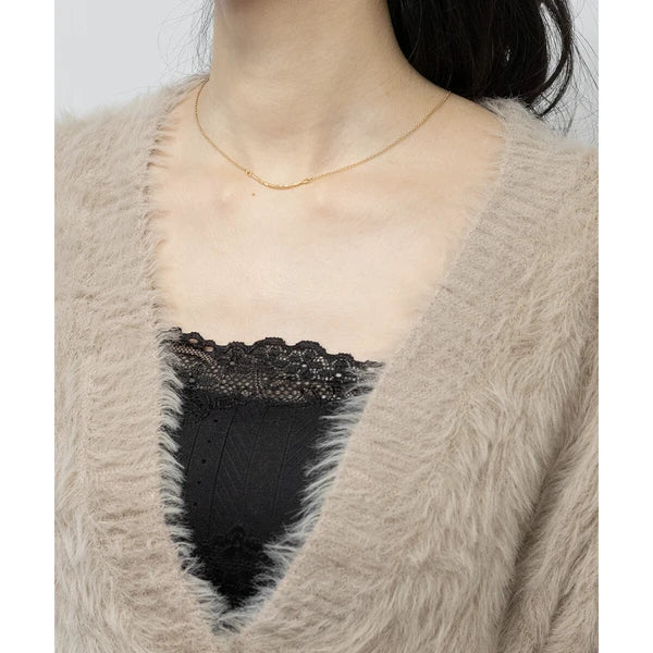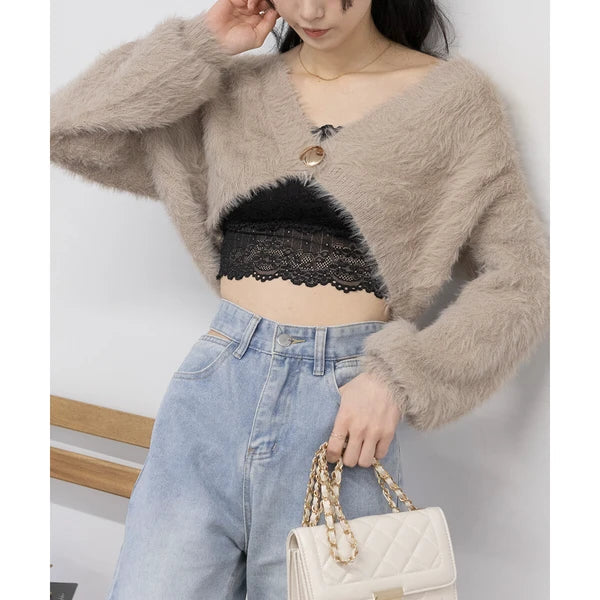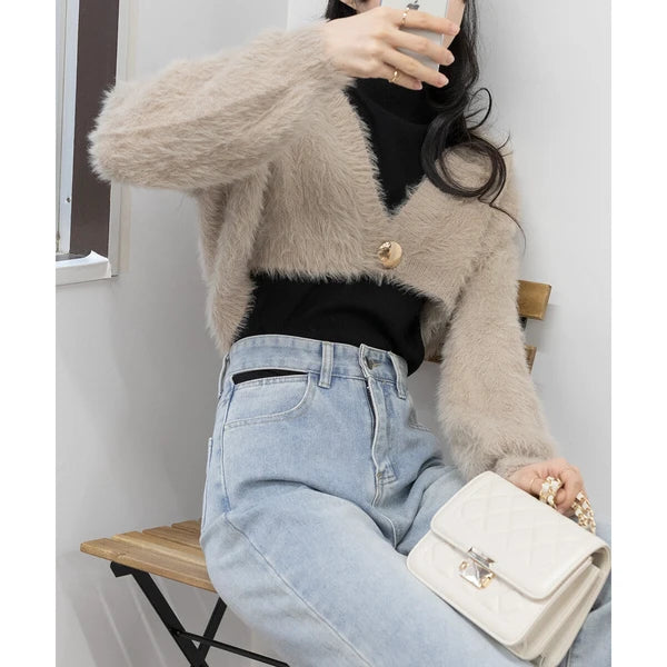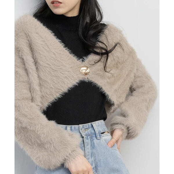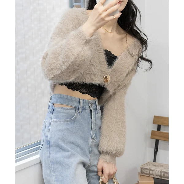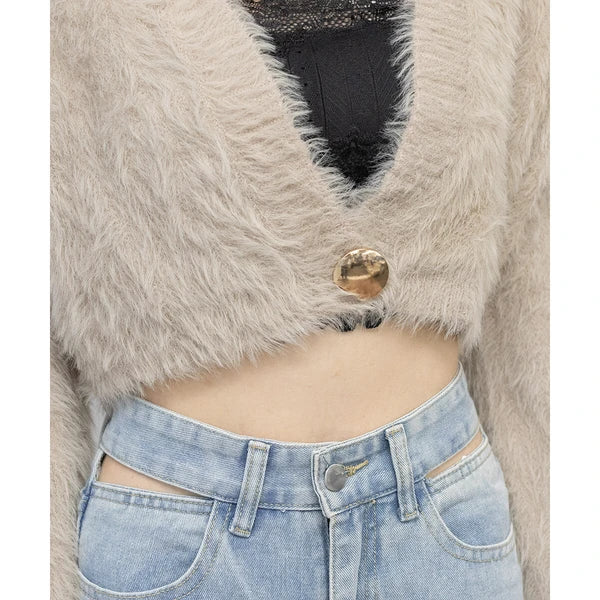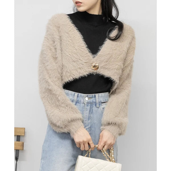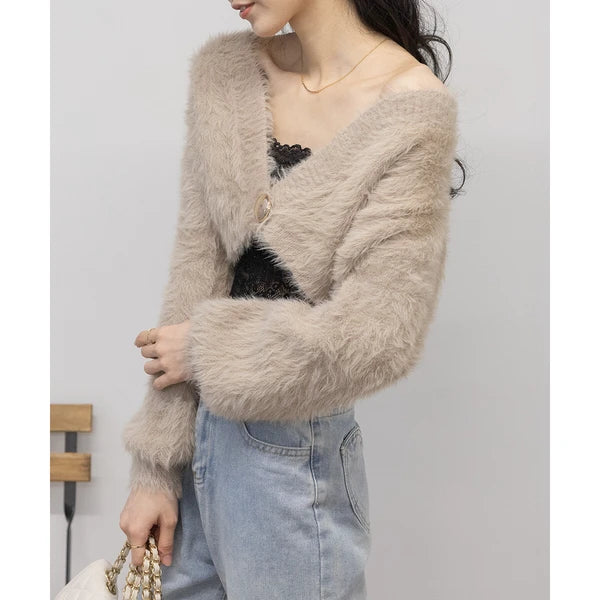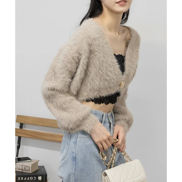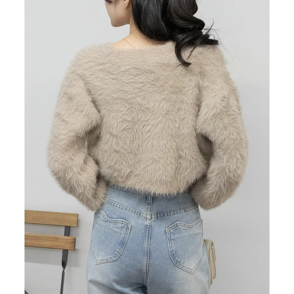 針織毛茸茸 V 領短款開襟衫 [OT212]