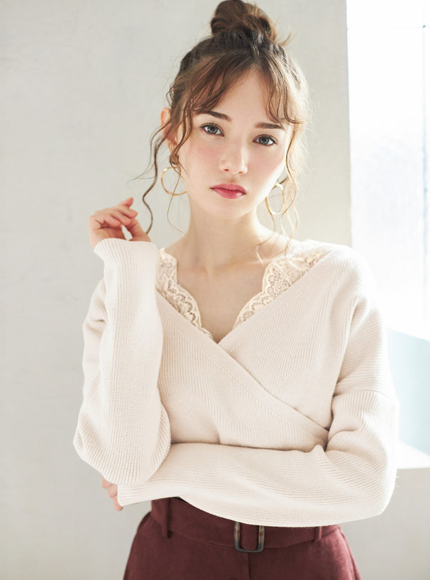 GRL 蕾絲交叉V領針織上衣 [TP210]