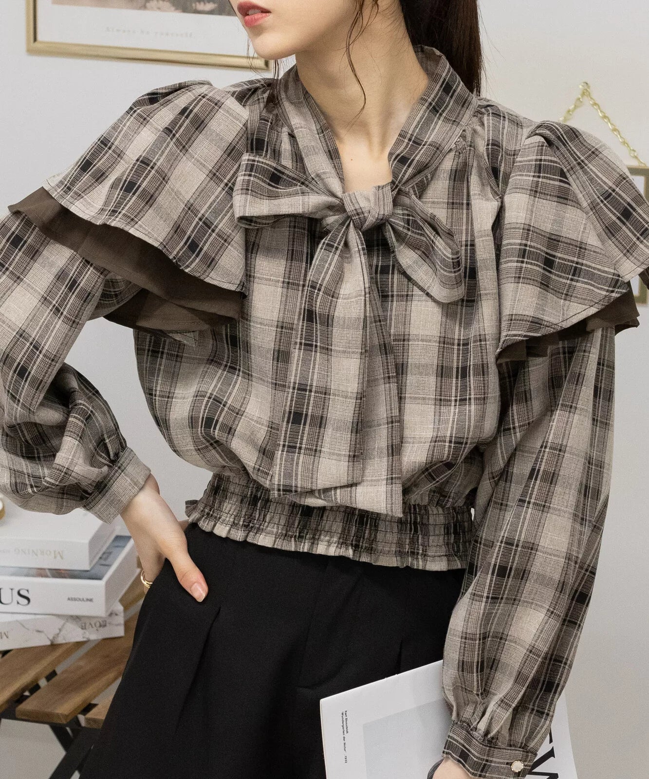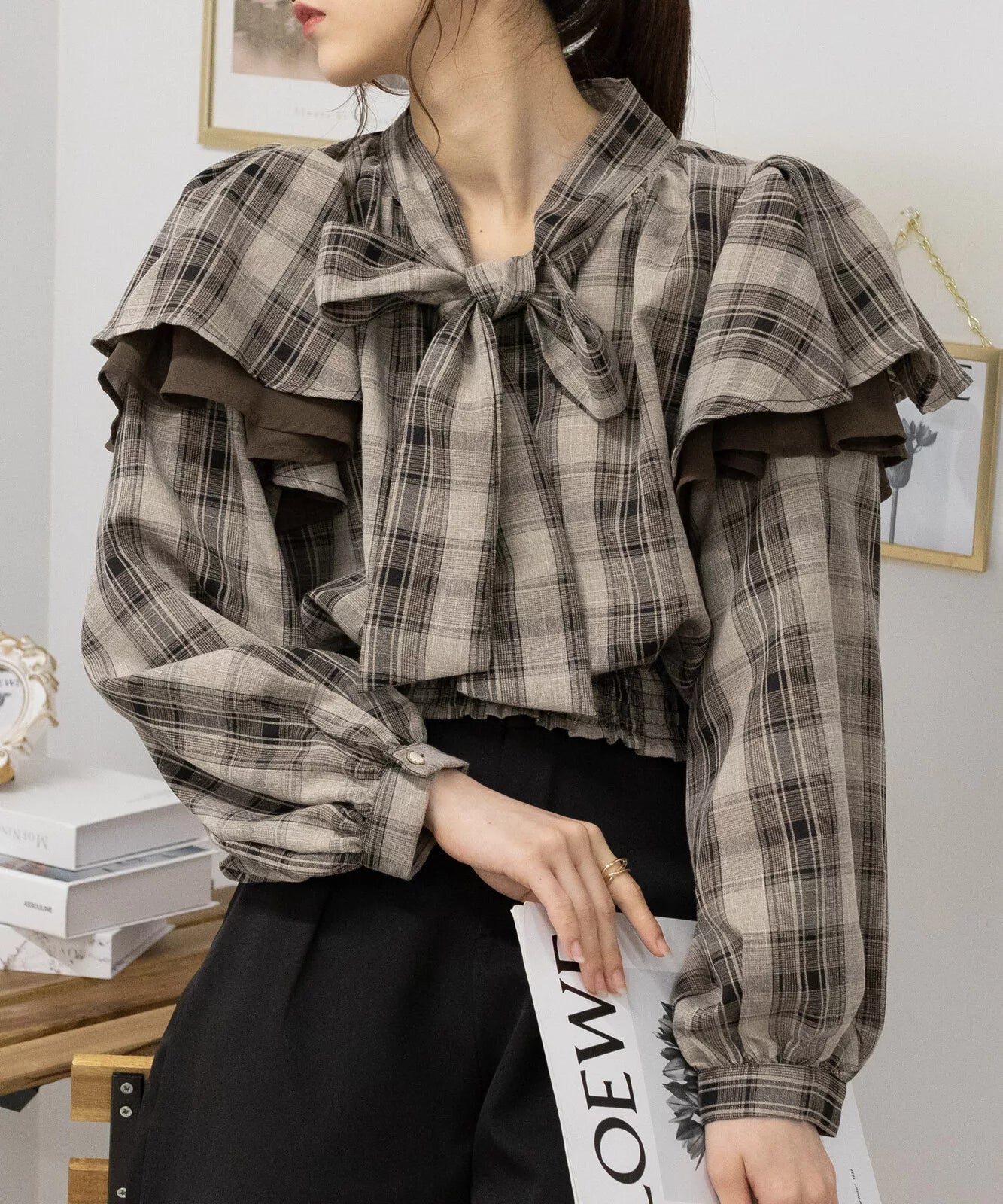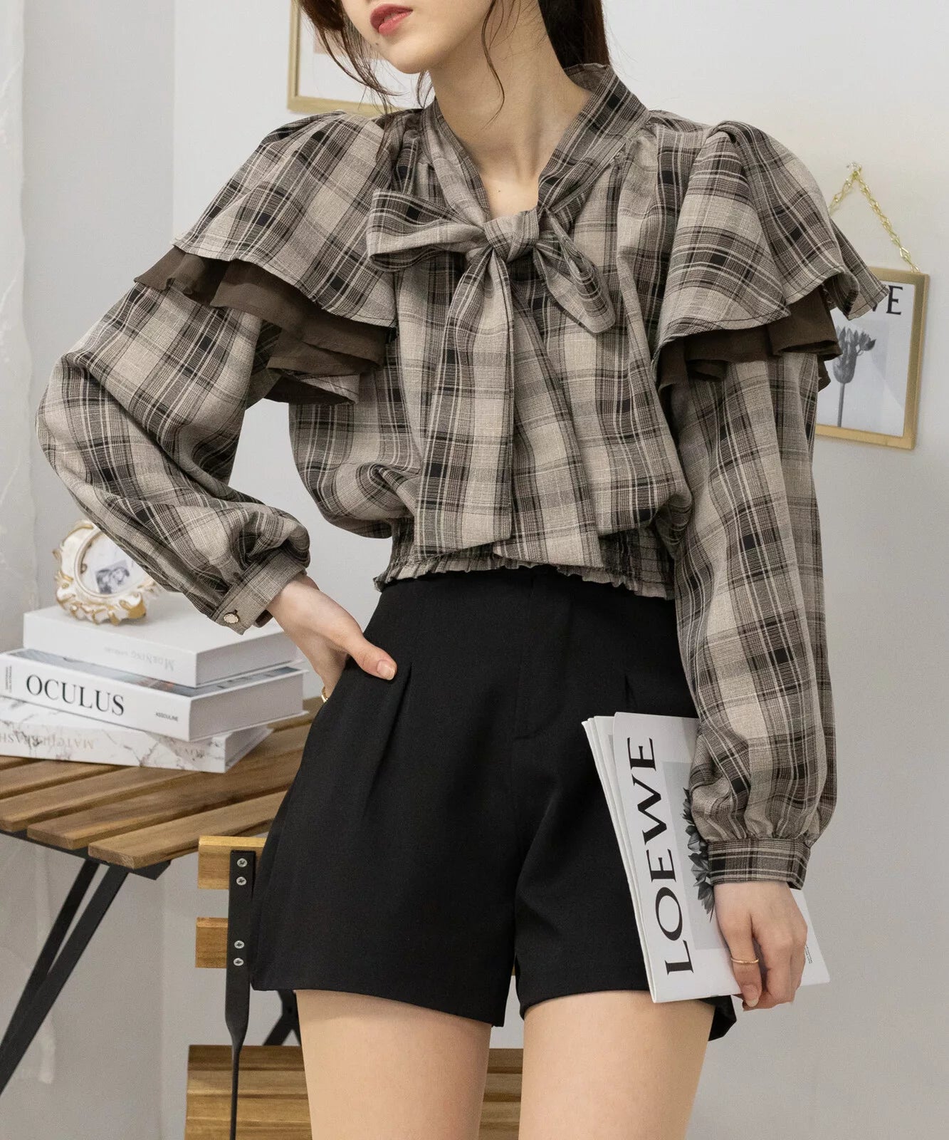 荷葉邊蝴蝶結格仔襯衫 [TP332]