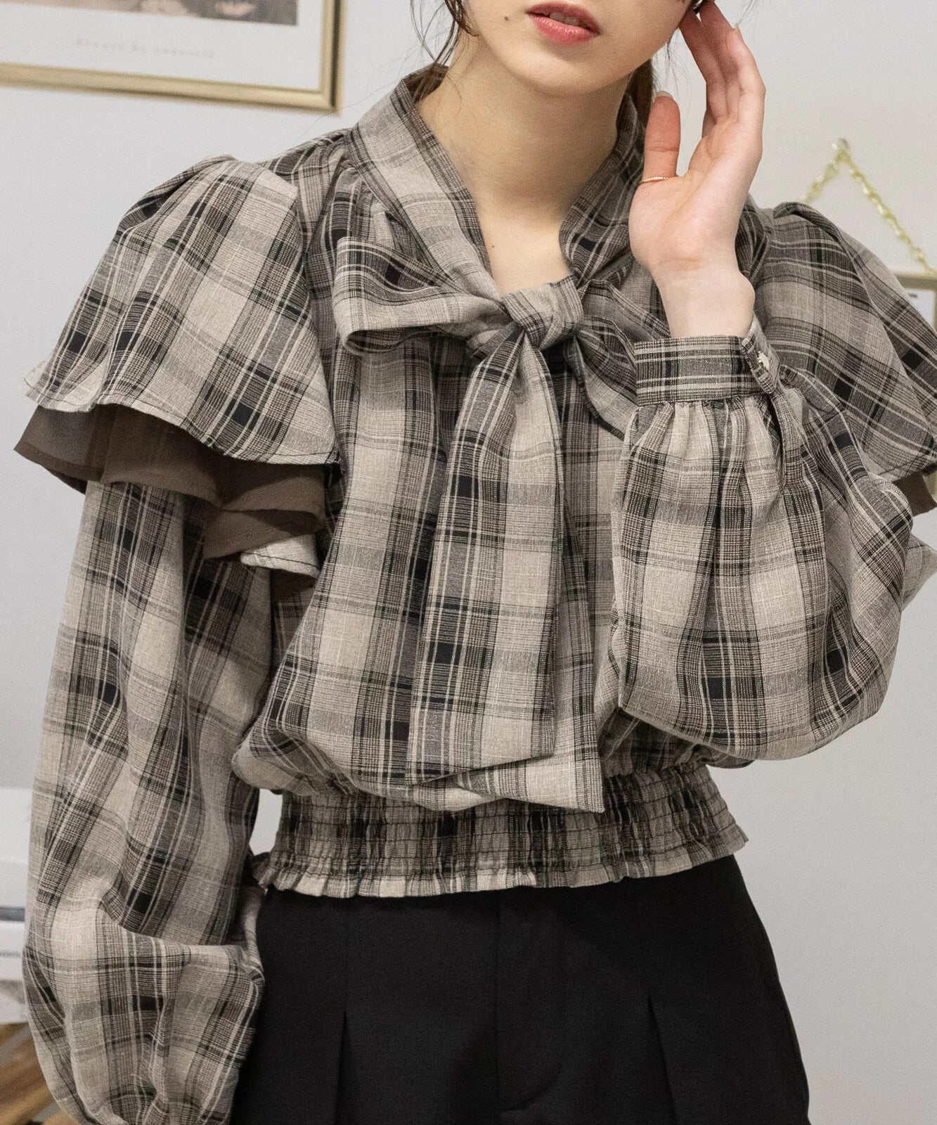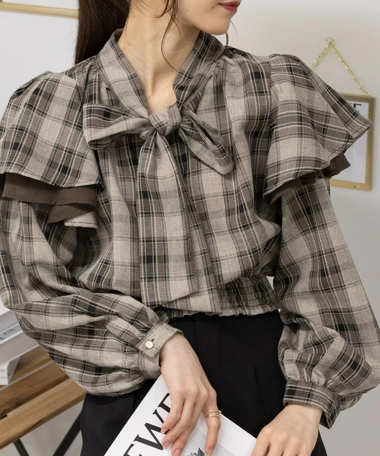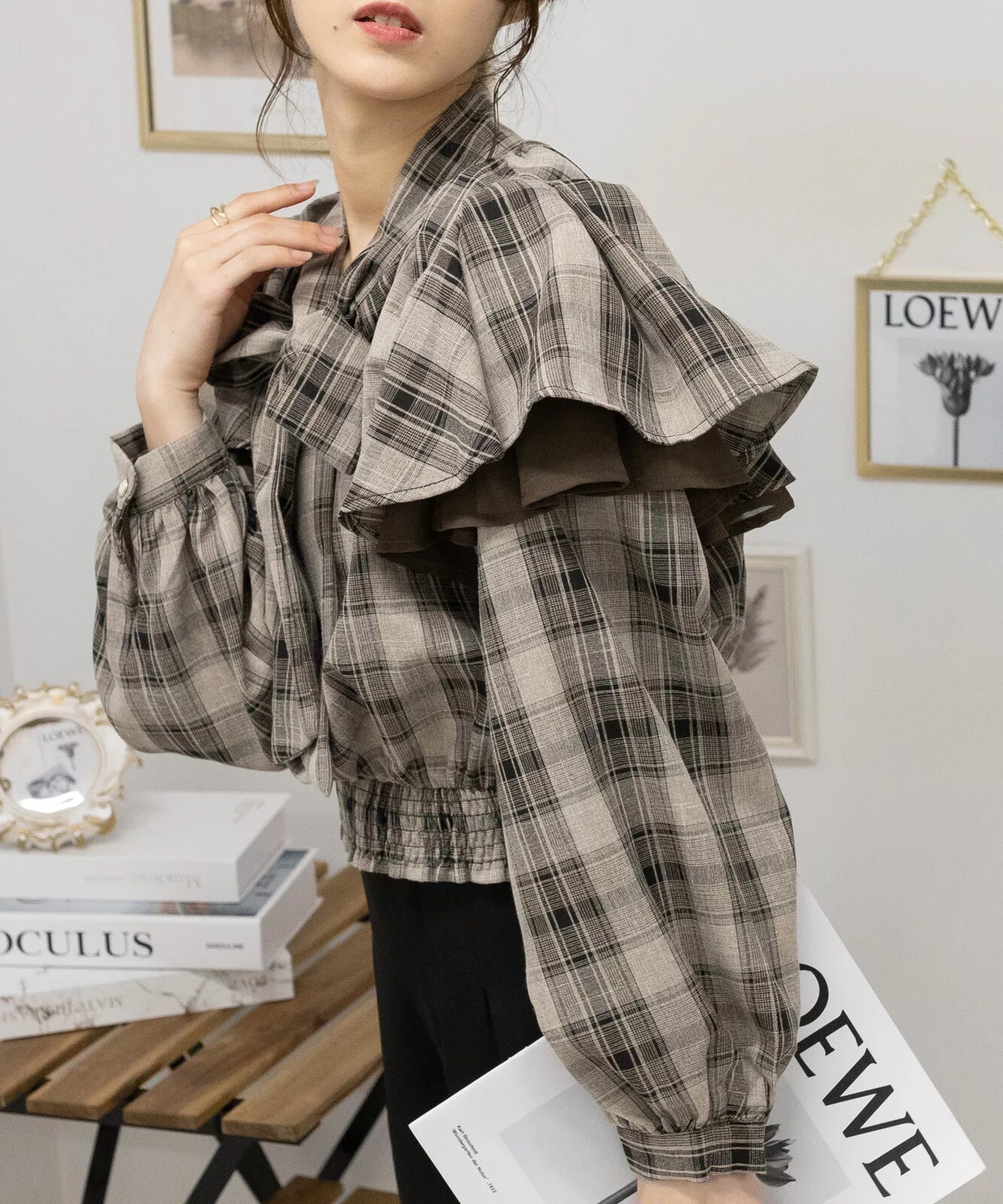 荷葉邊蝴蝶結格仔襯衫 [TP332]